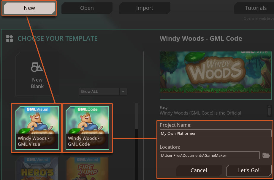 Create a new project using the Windy Woods template. You can choose either GML Code or GML Visual:
