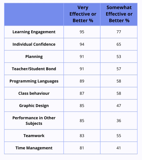 We also asked our pool of educators to evaluate the effects that teaching game programming had across 10 different learning objectives. Here are the results: