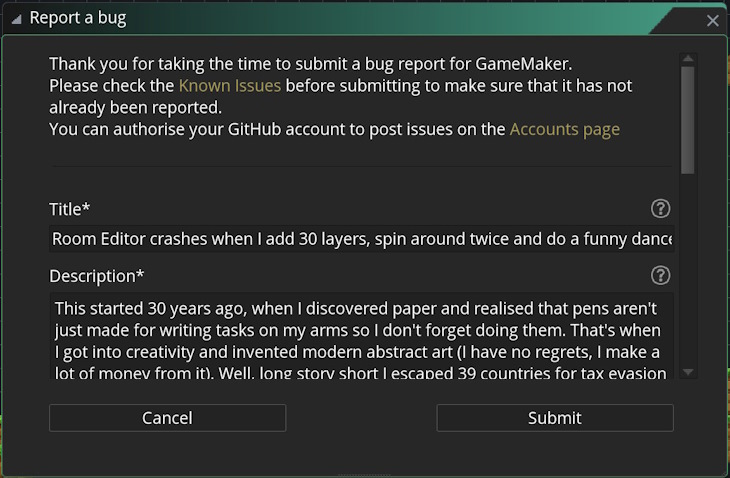 The reporter allows you to submit issues without needing a GitHub account, however it is recommend to connect your GitHub account to your GameMaker account.